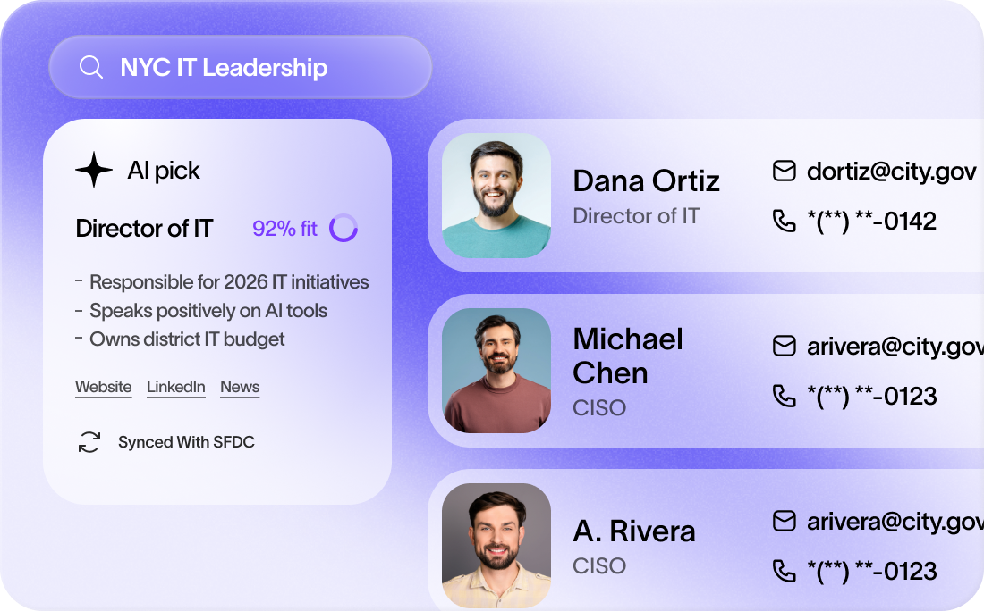 We connect directly with Salesforce, HubSpot, Outreach, and Apollo. Verified school, university, and agency contacts—along with signals and RFPs—sync to your workflows automatically so your reps don’t need to change how they work. See our full integrations list here.