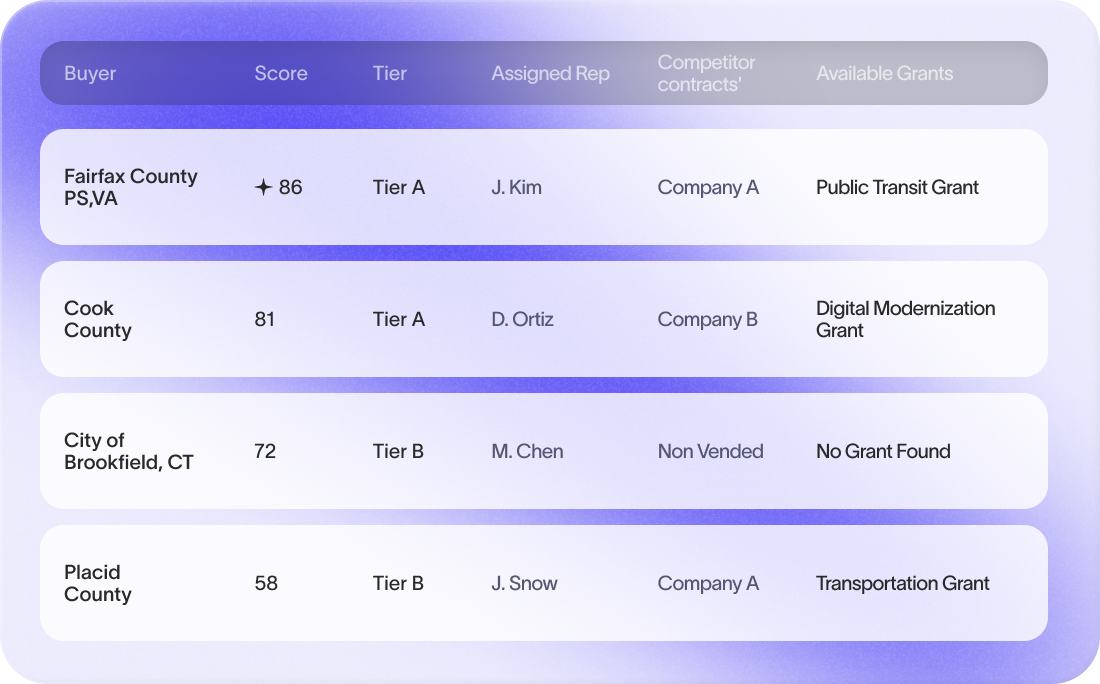 Starbridge tracks the signals that matter most—like contracts expiring, new budgets, grants, hiring plans, and board minutes—and delivers the hottest accounts to your team every week.