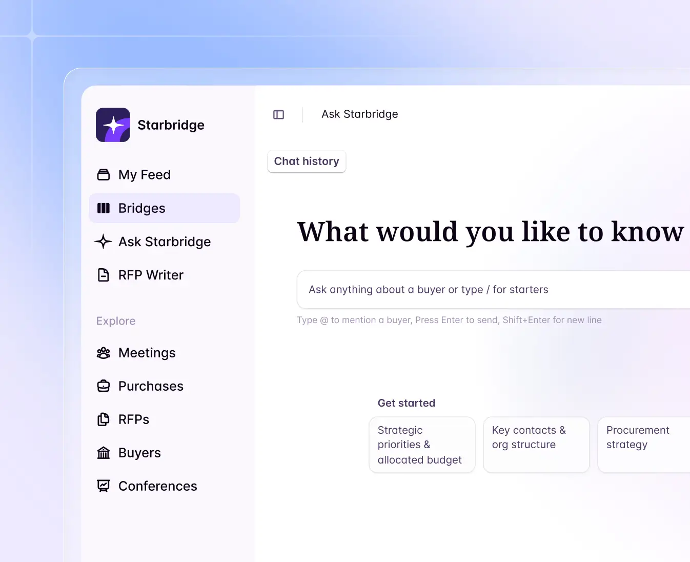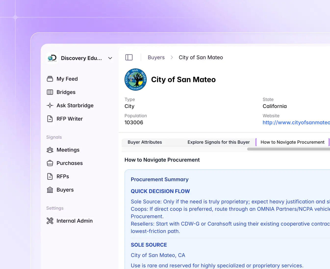 No more hunting across tools for account details. Starbridge centralizes buyer intelligence into one simplified view.
